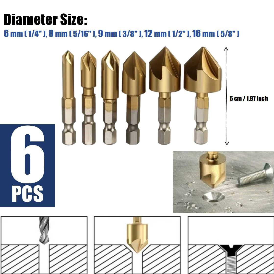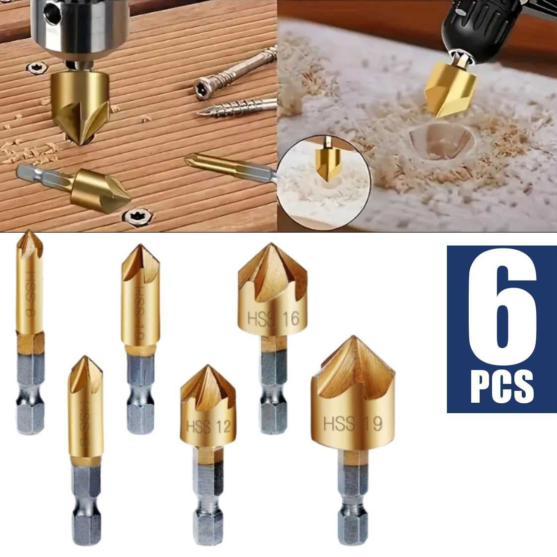 These flute countersink drill bit sets are machined from high-speed steels and are available in 6 different diameter sizes. Size - 6mm(1/4''), 8mm(5/16''), 9mm(3/8''), 12mm(1/2''), 16mm(5/8''), 19mm(3/4'')