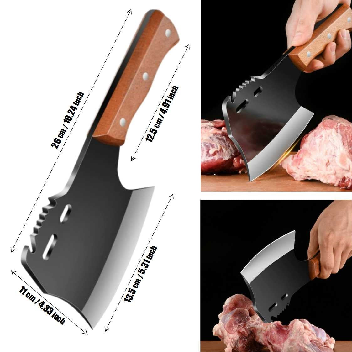 Premium Forged Blade: Crafted from high-carbon steel with a 4mm ultra-thick spine for exceptional durability and the ability to crack bones with ease. Hand-sharpened edges ensure smooth, precise cuts and long-lasting sharpness.
