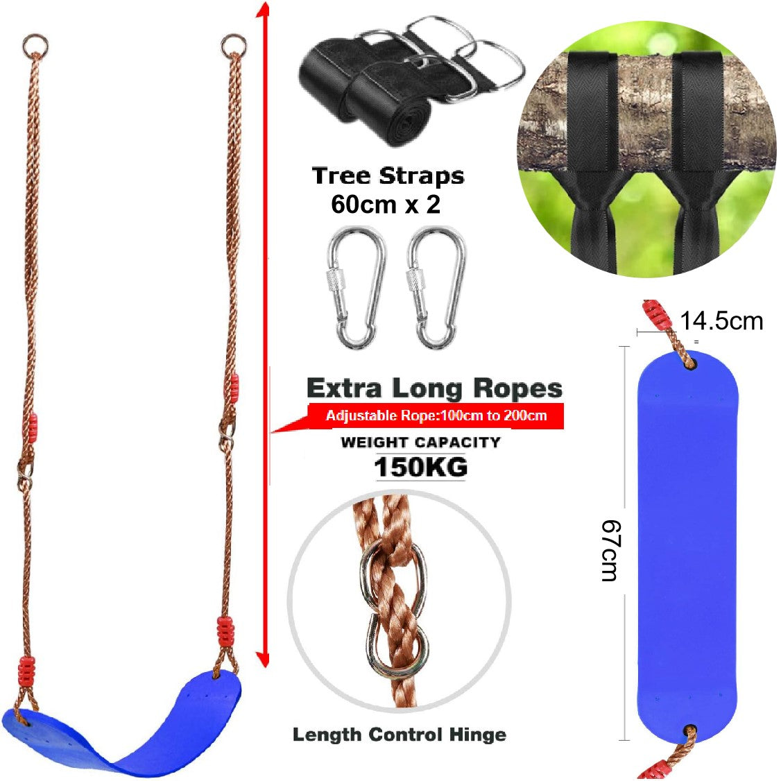 EASY TO INSTALL SWING KIT - Include a swing seat measuring 67cm wide by 14.5cm deep with 2-pack snap hooks and 2x 40cm tree straps.