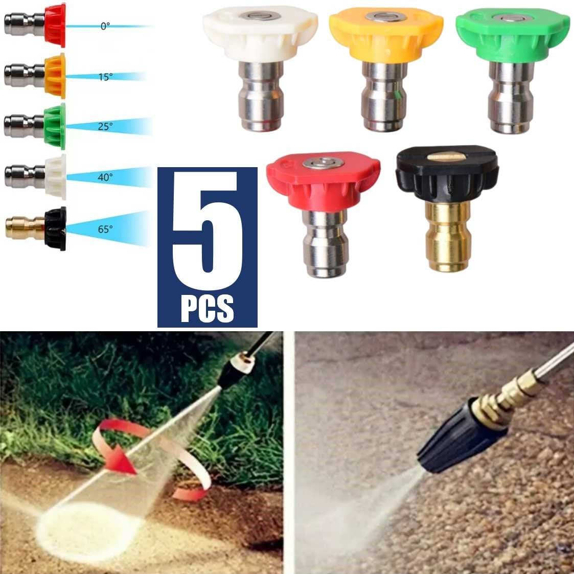 [Pressure Washer Nozzle Tips]: Pressure up to 4500 PSI, 1/4-inch quick connect, 2.5 orifice size, 2.5GPM, adjusts 5 different cleaning angles.