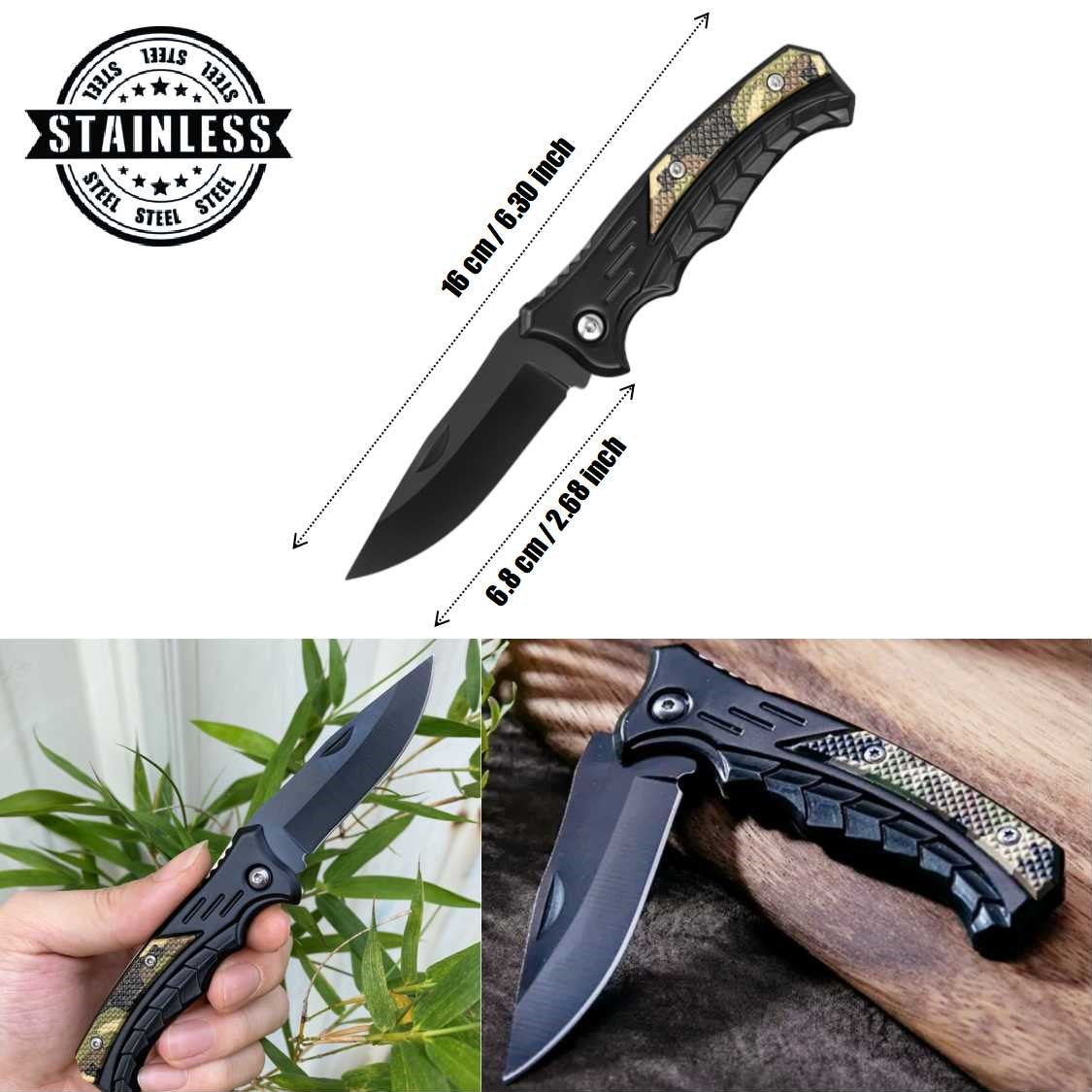 This compact folding knife is built for reliability in the outdoors. Crafted from high-hardness stainless steel, it delivers excellent edge retention, corrosion resistance, and cutting power. The non-slip ergonomic handle ensures a secure grip, even in wet conditions, while the foldable design makes it safe and easy to carry in your pocket, backpack, or tool kit.