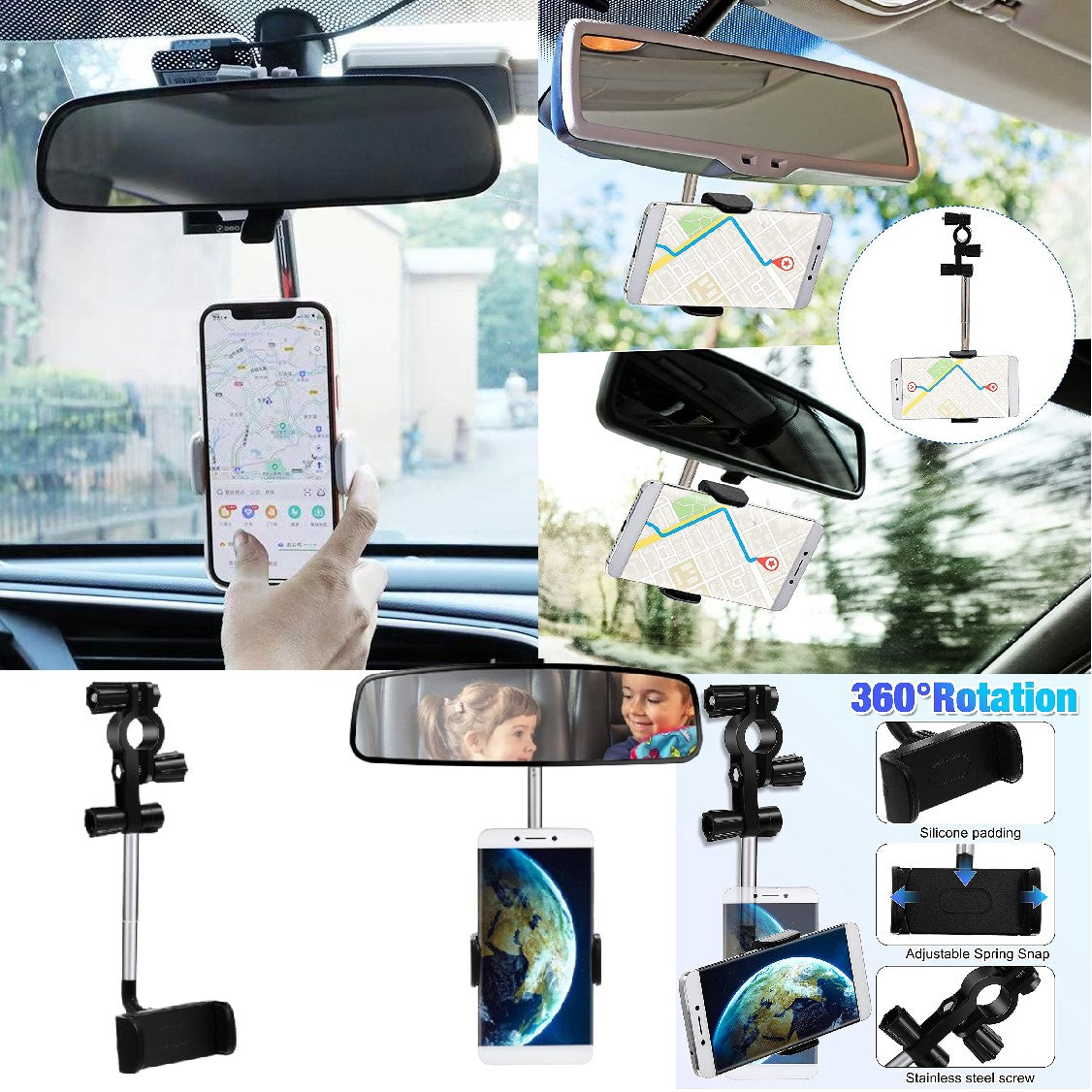 [360-degree Rotation]: multifunctional rearview mirror phone holder, supports horizontal and vertical screen switching, meeting the needs of different sightlines and moving at will, which is convenient for you to adjust to the required navigation angle, allowing you to plan your route and drive easily.